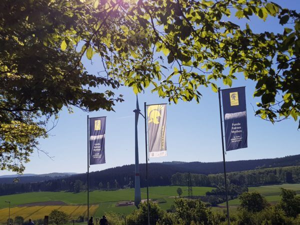 Das Info-Gebäude ist heute von 13 bis 16 Uhr geöffnet. Im Ausstellungsraum erwartet die Besucher eine kurze Einführung in die Thematik. Anhand von Repliken, zum Teil von den Originalfunden, werden die unterschiedlichen Ausrüstungen und die Militärtechniken der Kontrahenten dargestellt.