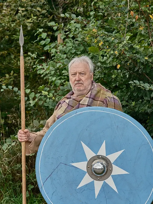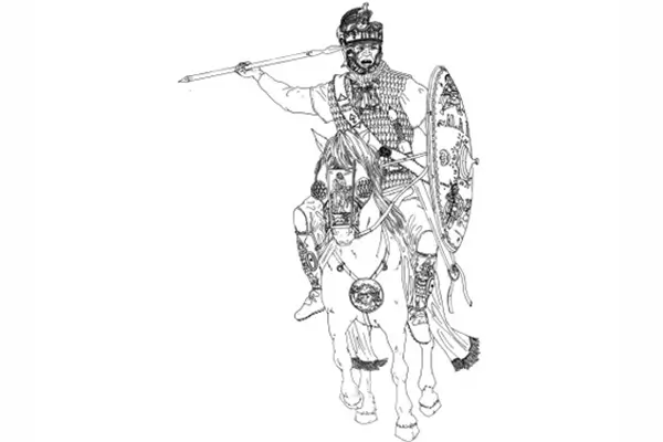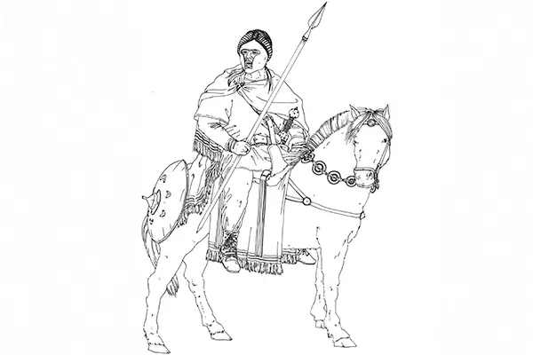 Abbildung: Germanischer Fürst (princeps) in prunkvoller Ausrüstung zu Pferd. (Zeichnung: Boris Burandt, Braunschweigisches Landesmuseum)
