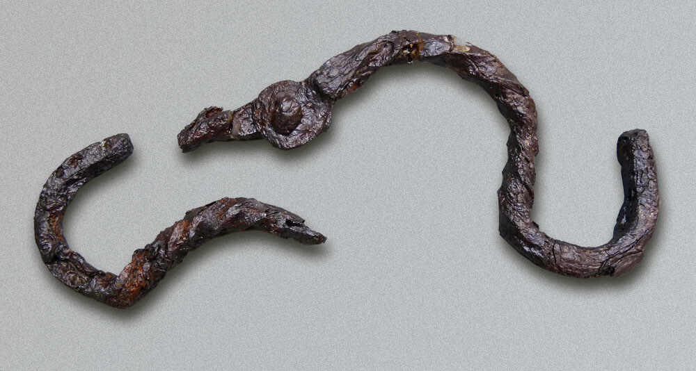 Hiervon zeugt ein zunächst eher unscheinbares Eisenobjekt vom Kahlberg, das aus zwei Haken, die mit einem Nietscharnier verbunden sind, besteht. Vermutlich diente es und zur Fesselung eines germanischen Gefangenen.